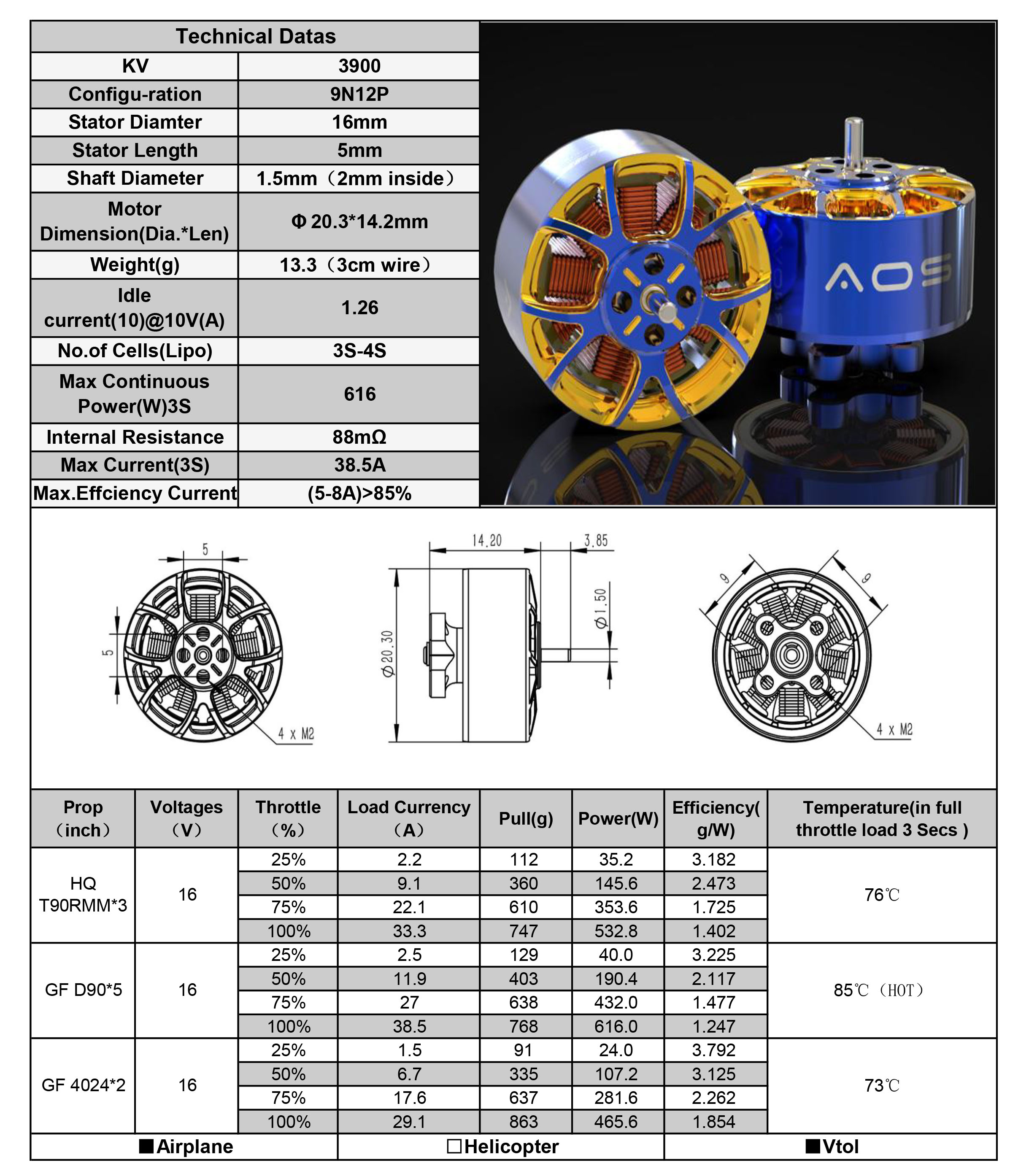 AOS 1605 má hmotnost 13,3 g se zkrácenými kabely. Motor je výsledkem rozsáhlých simulací, včetně 4D modelování magnetického pole, díky kterému je optimalizovaný pro co nejlepší rovnováhu mezi výkonem a efektivitou. Více o motoru se dozvíte zde nebo ve videu níže.