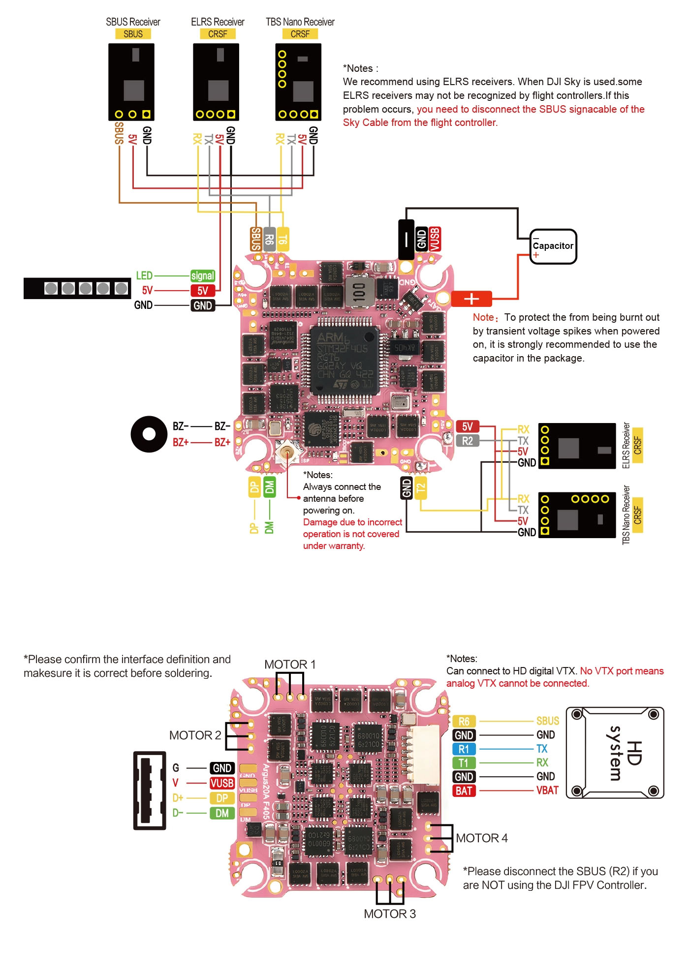 Základem řídicí jednotky je mikroprocesor STM32F405 a gyroskop ICM42688. Deska také disponuje 8MB pamětí pro blackbox a barometrem pro měření výšky. Regulátory zvládnou proud až 20A a používají firmware Bluejay. Jsou tak vhodné pro motory velikosti 1404 a podobné. ELRS přijímač na frekvenci 2,4GHz je připojen přes UART. Externí anténa se připojuje přes IPEX1 konektor. Napájení periferií zajišťuje 5V/2A BEC. Součástí desky je také senzor proudu.