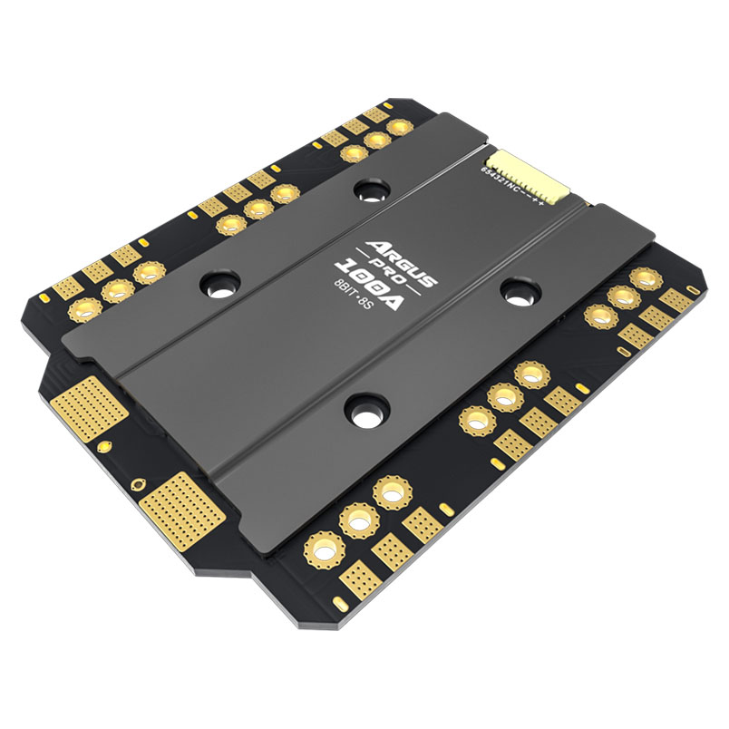 Axisflying Argus Pro 100A je unikátní ESC obsahující 6 regulátorů na jedné desce. Regulátory zvládnou proud až 100A a napájení v rozsahu 2-8S Lipo, takže jsou vhodné pro stavbu větších 10-15" hexakoptér.