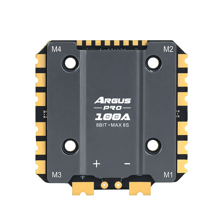 Axisflying Pro Eco 100A je výkonný regulátor, který zvládne proud až 100A a napájení až 8S baterií. Regulátor je tak vhodný především pro větší 10-15" drony. Regulátor je vybaven hliníkovým chladičem pro lepší odvod tepla. Chladič také chrání citlivou elektroniku před nečistotami. Součástí regulátoru je senzor proudu. K regulátoru je nutné zapojit i externí elektrolytický kondenzátor. Regulátor má větší rozměry 56x57x7mm. Ujistěte se, že je v rámu dostatek prostoru. Montážní díry jsou standardní rozteče 30,5x30,5mm. Regulátor používá firmware Bluejay.