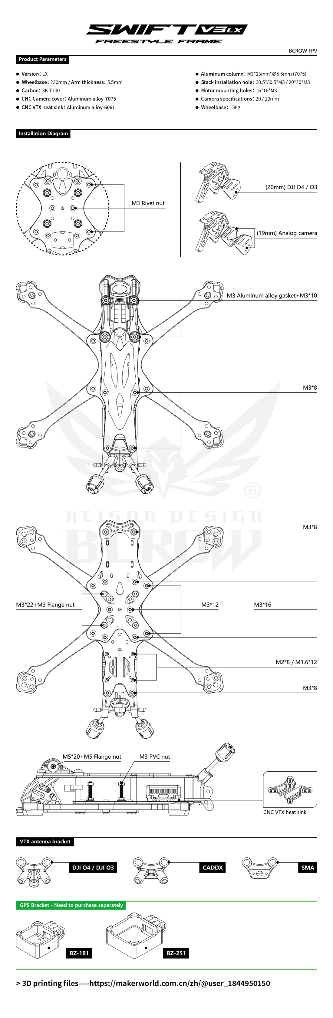 BCrow Swift V3 LX je špičkový rám určený pro stavbu freestylového dronu. Konstrukce ve Wide-X konfiguraci je ideální pro rychlé a přesné akrobatické létání. Rám vyniká vysokou odolností a přitom si zachovává rozumnou hmotnost 136 gramů. Podporuje jak analogové, tak digitální video systémy, včetně DJI O4 Pro.