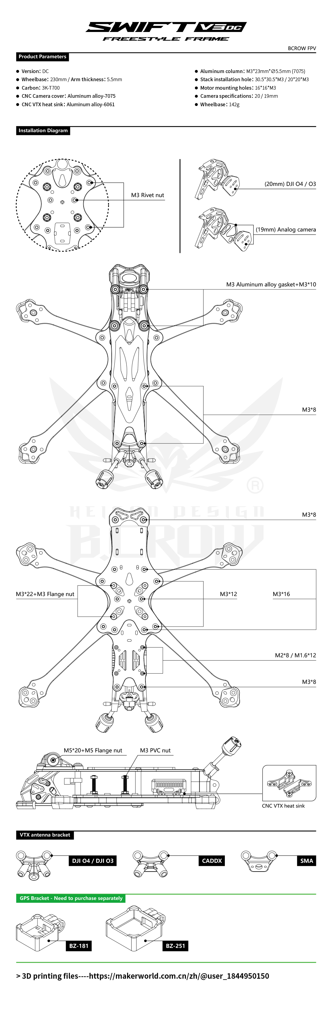 BCrow Swift V3 DC je špičkový rám určený pro stavbu freestylového dronu. Konstrukce v Deadcat konfiguraci je ideální použití s digitálním přenosem videa. Přední ramena jsou posunuta více do strany, takže ve videu nejsou vidět rušivé kraje vrtulí. Rám vyniká vysokou odolností a přitom si zachovává rozumnou hmotnost 142 gramů. Podporuje jak analogové, tak digitální video systémy, včetně DJI O4 Pro.