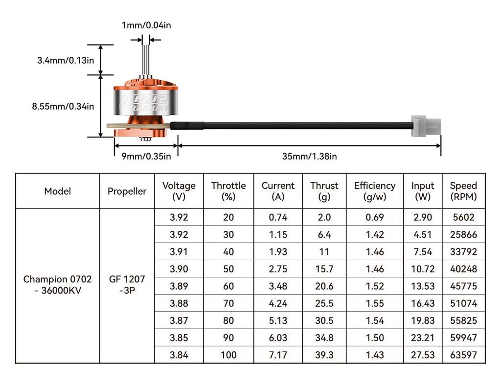 BetaFPV 0702 36000Kv jsou malé motory vhodné především pro nejmenší 1S 65mm Tinywhoopy jako je BetaFPV Air65 II. Motory ve verzi Champion mají kromě velmi vysokého Kv také kuličková ložiska. Jsou tak vhodné pro ty nejlehčí a nejrychlejší Tinywhoopy a zkušené piloty. Motory používají tenké 0,1 mm lamely, čímž jsou sníženy magnetické ztráty a zlepšena účinnost. Motory mají hřídel o průměru 1 mm a M1.4 montážní díry na průměru 6,6 mm. Jsou vybaveny 30AWG kabelem o délce 35 mm, který je zakončen JST1.25 konektorem pro přímé zapojení do AIO desky.