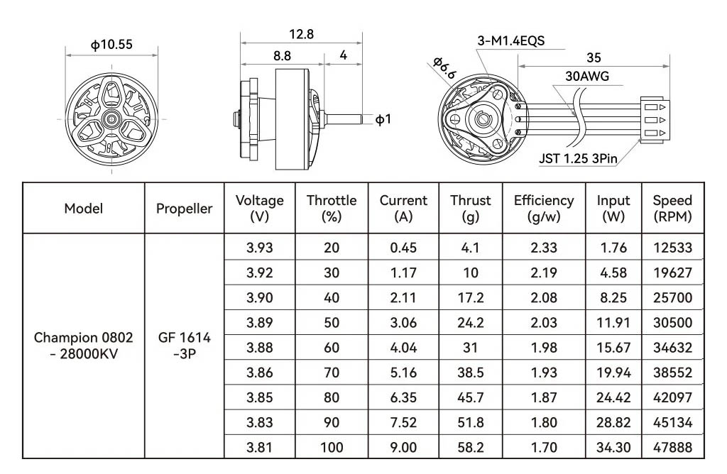 BetaFPV 0802 28000Kv jsou malé motory vhodné především pro nejmenší 1S 65 a 75mm Tinywhoopy jako je BetaFPV Air75 II. Motory ve verzi Champion mají kromě velmi vysokého Kv také kuličková ložiska. Jsou tak vhodné pro ty nejlehčí a nejrychlejší Tinywhoopy a zkušené piloty. Motory používají tenké 0,1 mm lamely, čímž jsou sníženy magnetické ztráty a zlepšena účinnost. Motory mají hřídel o průměru 1 mm a M1.4 montážní díry na průměru 6,6 mm. Jsou vybaveny 30AWG kabelem o délce 35 mm, který je zakončen JST1.25 konektorem pro přímé zapojení do AIO desky.