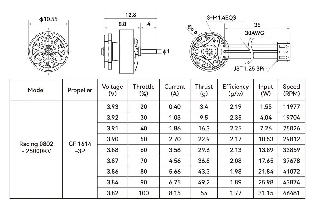BetaFPV 0802 25000Kv jsou malé motory vhodné především pro nejmenší 1S 65 a 75mm Tinywhoopy, jako je BetaFPV Air75 II. Motory ve verzi Racing mají vyšší Kv a standardní kluzná mosazná pouzdra. Jsou tak vhodné pro rychlé závodní Tinywhoopy a zkušené piloty. Motory používají tenké 0,1 mm lamely, čímž jsou sníženy magnetické ztráty a zlepšena účinnost. Motory mají hřídel o průměru 1 mm a M1.4 montážní díry na průměru 6,6 mm. Jsou vybaveny 30AWG kabelem o délce 35 mm, který je zakončen JST1.25 konektorem pro přímé zapojení do AIO desky.