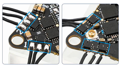 STM32G473 a gyroskopem ICM42688P. K dispozici je také 16MB paměť pro blackbox. Integrované 4v1 regulátory zvládnou proud 5A a používají firmware Bluejay. Motory se na desku pájí. Při pájení doporučujeme dbát zvýšené opatrnosti. Při velkém zahřátí desky hrozí riziko odpájení komponent na druhé straně.