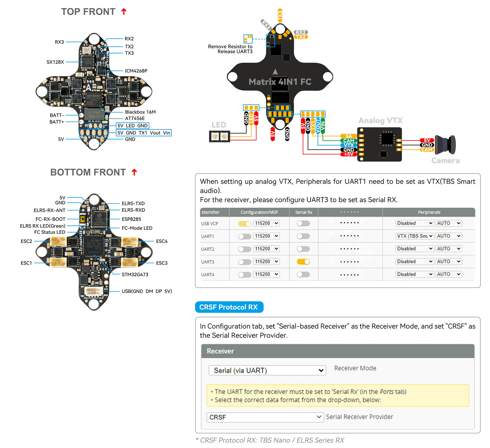 RC přenos zajišťuje integrovaný ELRS 2,4 GHz přijímač připojený přes UART. UART propojení je na desce dostupné a v případě potřeby lze integrovaný přijímač odpojit a připojit externí. Interní ELRS přijímač používá drátovou anténu napájenou přímo na desku.