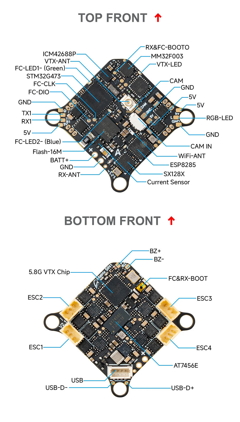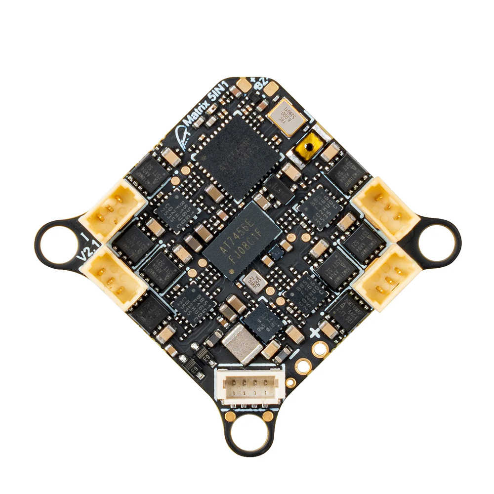 Řídicí jednotka je vybavena procesorem STM32G473 a gyroskopem ICM42688P. K dispozici je také 16 MB paměť pro blackbox. Integrované 4v1 regulátory zvládnou v druhé verzi proud až 12 A a používají firmware Bluejay.