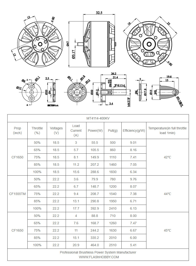 Flashhobby 4114 400Kv je motor vhodný drony s 15–17″ vrtulemi a 6S baterií, které cílí spíše na dlouhou dobu letu než vysoký výkon. Motor využívá magnety třídy 48SH a měděné vinutí s vysokou tepelnou odolnost. Zvon motoru je vyroben z hliníku 6061-T6, který nabízí dobrý poměr pevnosti a hmotnosti. O hladký chod se starají kvalitní ložiska NSK/NMB.