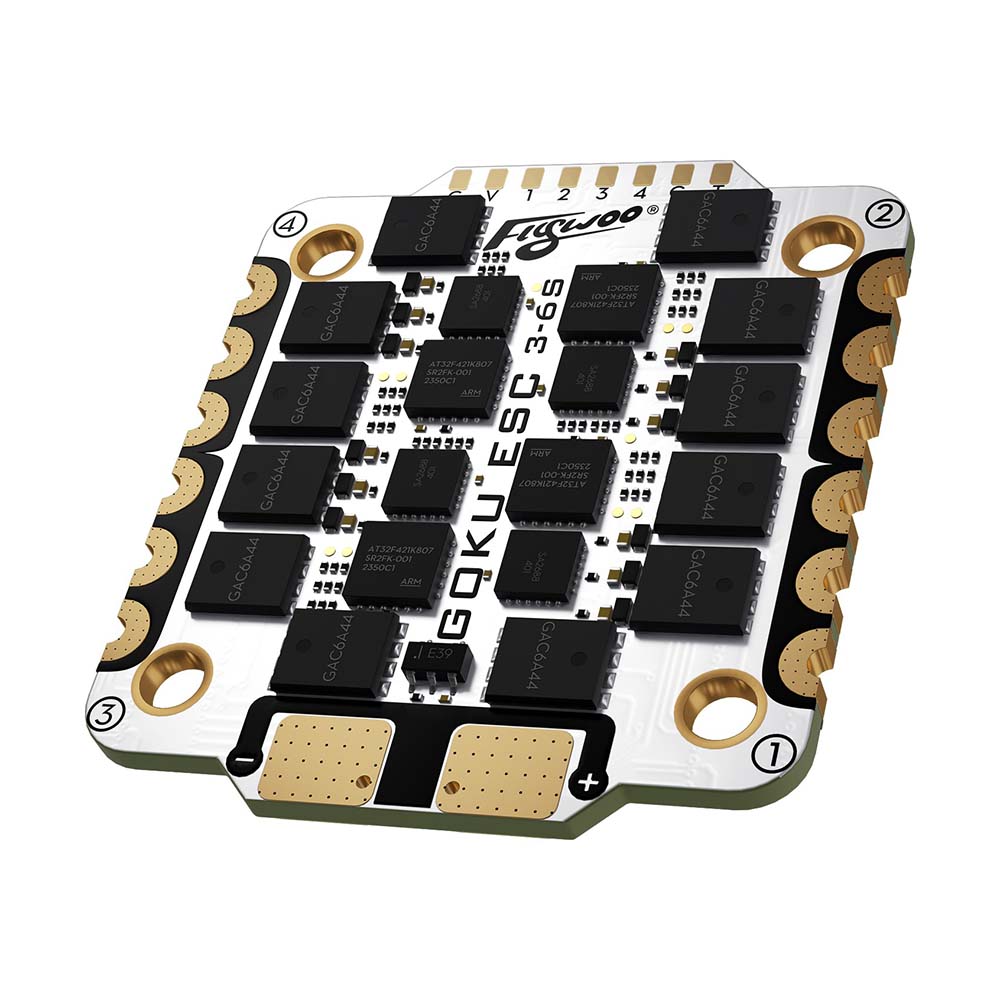 Flywoo GOKU G55M AM32 je 32bitový regulátor určený pro freestyle i závodní drony napájené 3–6S LiPo baterií. Regulátory zvládnou proud až 55 A na kanál. Regulátor používá moderní firmware AM32, který podporuje bidirectional DShot, telemetrii i výstupní PWM frekvenci až 96 kHz.