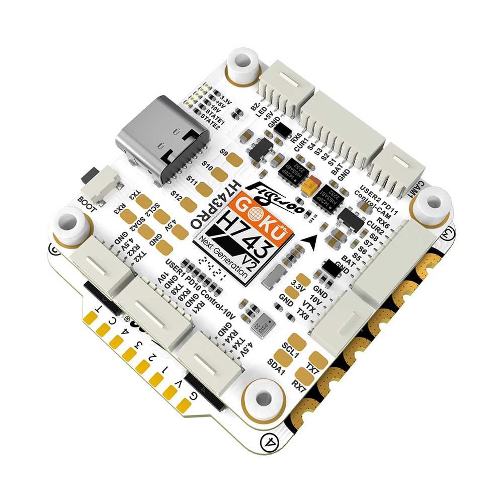 Flywoo GOKU H743 Pro + 55A AM32 je kombinace řídicí jednotky s regulátory vhodná pro 5" FPV drony i 7" long-range drony napájené 3–6S LiPo baterií.