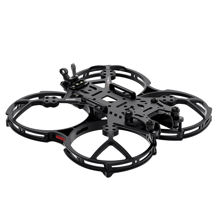 GEPRC Cinelog35 V3 je třetí verzí Cinewhoop dronu pro 3,5" vrtule navržený pro použití s DJI O4 Pro jednotkou. Rám je velmi dobře zpracovaný a promyšlený. V přední části je držák HD kamery a FPV kamery, který je uchycený na gumových softmountech. Kamera není tak vystavena vibracím z rámu, což napomáhá lepšímu obrazu a kvalitnější stabilizaci. Ve střední části je místo pro Lipo baterii. Rám disponuje hliníkovými díly pro uchycení lipo pásku, který není provlečený na řídicí jednotkou a nedrhne o komponenty. V zadní části rámu je na pevno předělaný XT60 konektor. Kabely od baterie tedy vedou přesně kam mají a jsou mimo dosah vrtulí. Celé horní plato je vyřezané z 3,5mm karbonu. Vrtule jsou chráněny plastovými kryty, které jdou samostatně dokoupit jako náhradní díly. Toto všechno dělá z rámu Cinelog35 jeden z nejlepších Cinewhoopů na trhu.