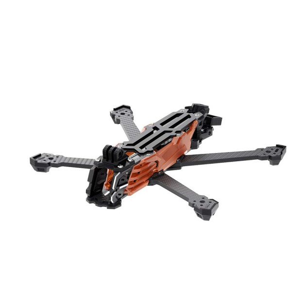 Geprc Vapor D5 je freestylový rám pro 5" vrtule a digitální systém přenosu obrazu DJI O4 Pro. Rám má ramena posunuta více dozadu, díky tomu nejsou ve videu vidět rušivé kraje vrtulí, což oceníte především při pořizování až 4K záznamu na DJI O4 Pro jednotku. Pro vysokou odolnost jsou ramena vyřezána z 5mm tlustého karbonu. V případě potřeby lze ramena velmi snadno vyměnit povolením dvou šroubů. Kamera je uchycena v hliníkových bočnicích přes gumové vložky. Ty pomáhají minimalizovat vibrace přenášené do kamery. Ve střední části dronu jsou montážní díry pro 20x20mm i 30,5x30,5mm stacky. V zadní části je pak prostor po umístění analogového nebo digitálního video vysílače. Pro snadnou instalaci jsou k dispozici montážní díry s roztečí 20x20mm, 25x25mm i 30,5x30,5mm. Citlivá elektronika v těle dronu je kryta před nečistotami plastovými bočnicemi. Hmotnost rámu je cca 221 gramů. Součástí balení jsou i Lipo pásky, podložky pod baterii a 3D tištěné díly včetně držáku GoPro kamery.