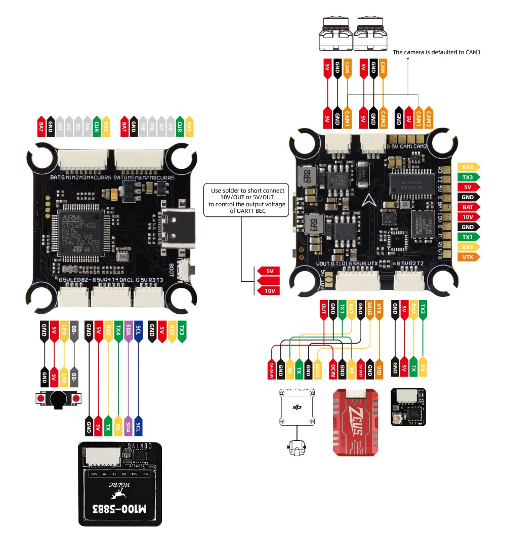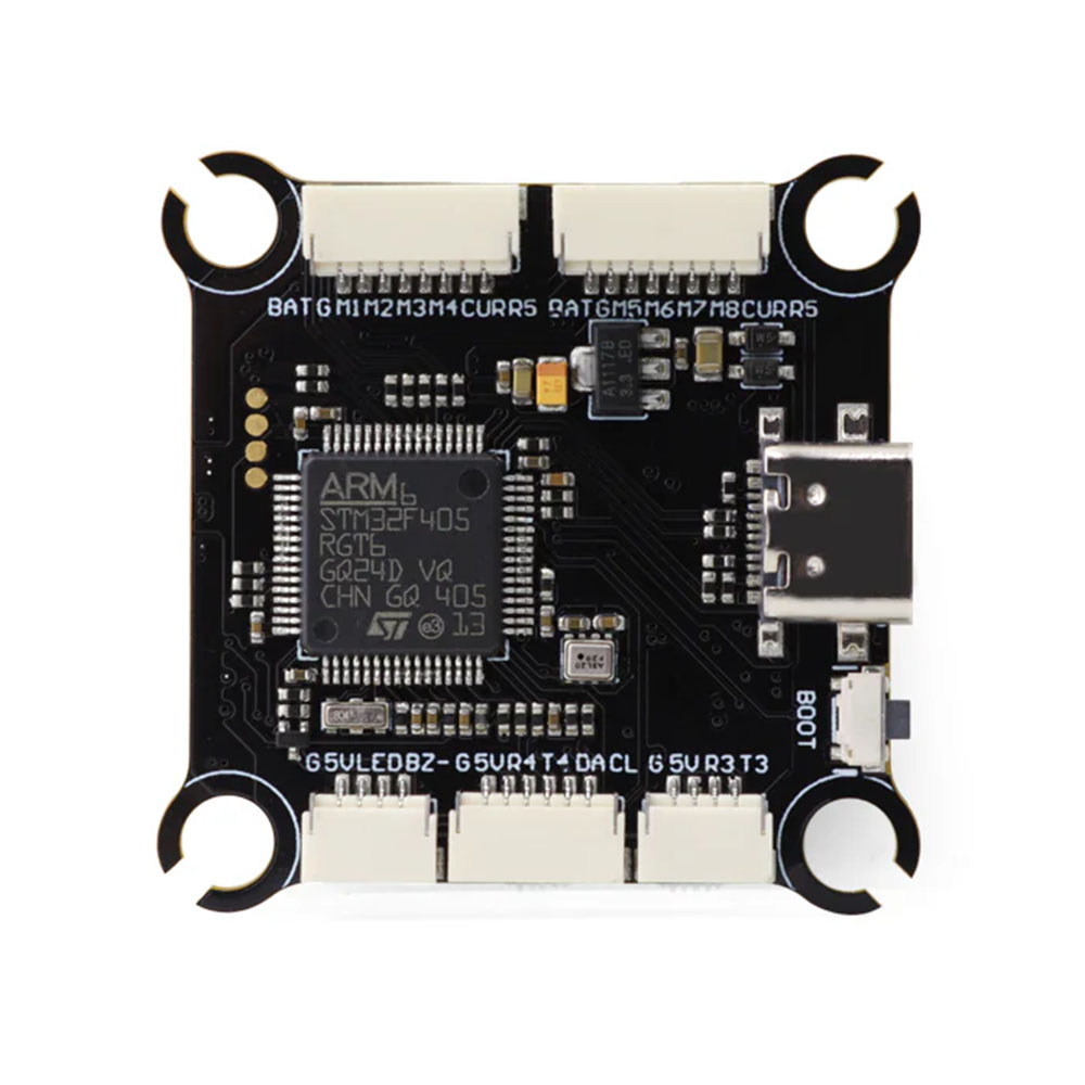 Základem řídicí jednotky je mikroprocesor F405 doplněný gyrem ICM42688P. Deska dále disponuje barometrem pro měření výšky a 16MB pamětí pro blackbox. Výhodou je možnost připojení až 8 motorů a dvou kamer, mezi kterými lze přepínat. Deska je vybavena konektory pro snadné zapojení bez nutnosti pájení.
