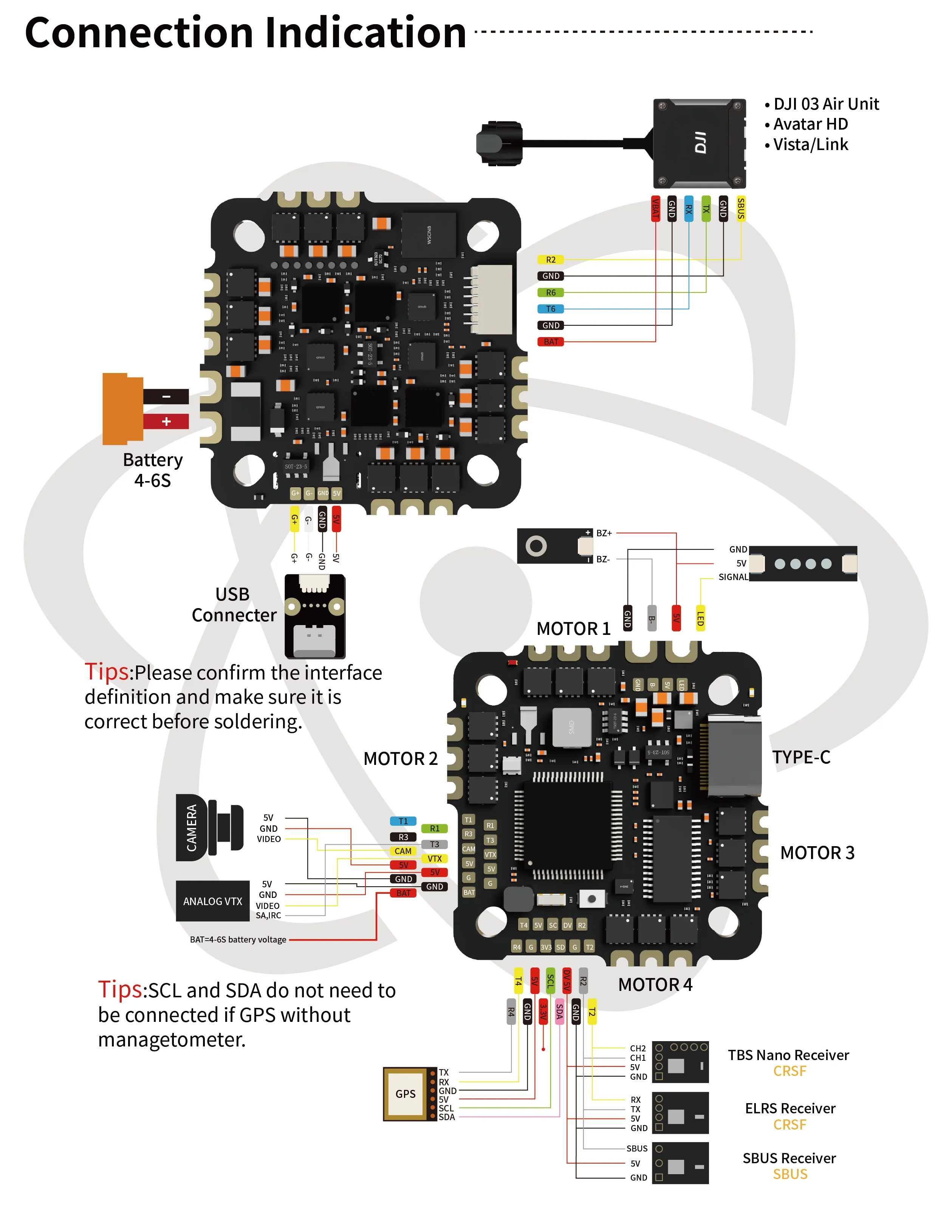 Deska je vybavena konektorem pro připojení digitálních video vysílačů. K dispozici jsou rovněž pady pro připojení analogové kamery a analogového video vysílače.