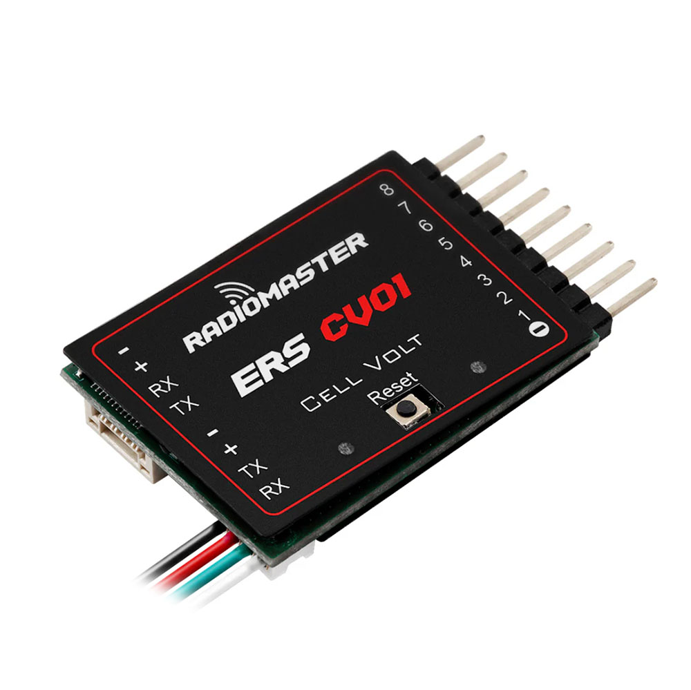 RadioMaster ERS-CV01 je kompaktní senzor napětí jednotlivých článků baterie určený pro ExpressLRS přijímače. Je navržen především pro PWM ELRS přijímače používané v modelech letadel bez řídicí jednotky. Senzor se připojuje přes UART rozhraní a komunikuje protokolem CRSF. Je kompatibilní s přijímači Radiomaster ER6, ER8, ER8G a ER8GV i s dalšími ELRS přijímači s volným UART portem. Díky UART vstupu i výstupu je možné řetězit více senzorů za sebou.