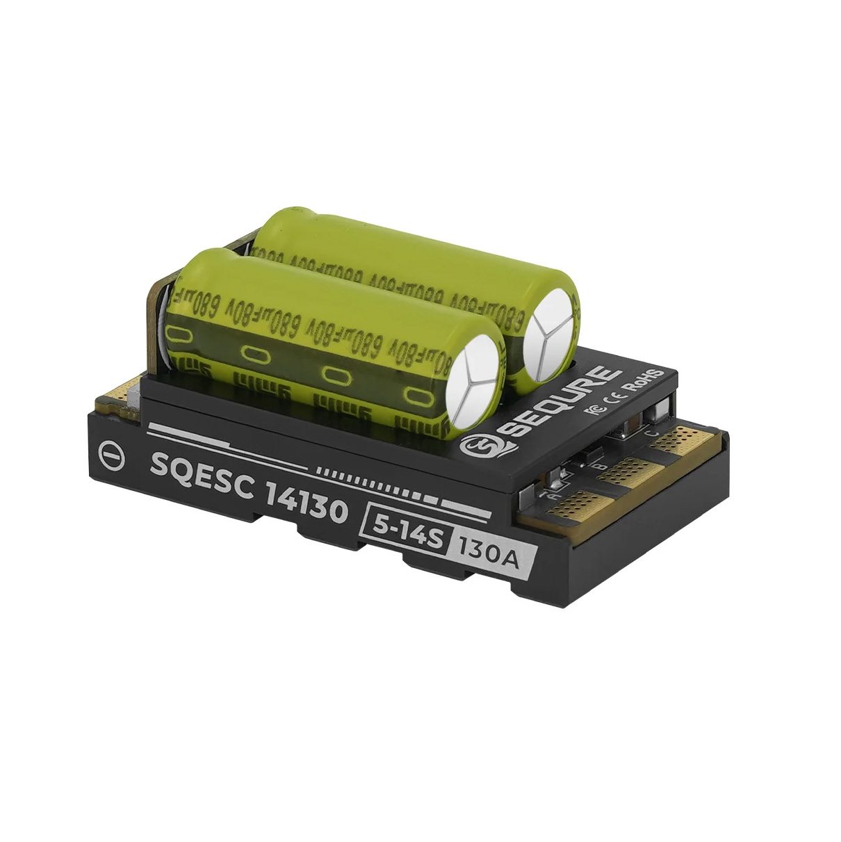 Sequre 14130 je výkonný samostatný regulátor pro větší modely letadel nebo long-range a cinelifter drony. Regulátor podporuje napájení 5-14S Lipo baterií a proud až 130A. Základem regulátoru je výkonný 32bitový mikroprocesor STM32G071, který používá firmware AM32 s podporou telemetrie. Pro dobrý odvod tepla je regulátor vybaven hliníkovým chladičem z obou stran. Elektrolytické kondenzátory jsou již nainstalované na regulátoru, takže není třeba přidávat externí, což usnadňuje montáž. Regulátor nabízí výborné parametry při zachování kompaktních rozměrů 55x30x23mm a hmotnosti 62 gramů. Regulátor není vybaven BEC.