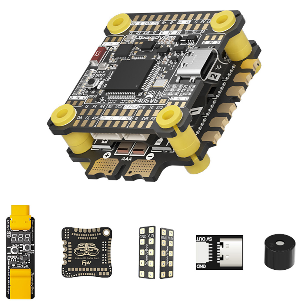 Součástí Deluxe stacku je také SpeedyBee Smart Power Tester (smoke stopper), deska pro nácvik pájení, buzzer, externí USB-C konektor a rozvodná deska napětí (Power expansion board). SpeedyBee Smart Power Tester v případě zkratu (nebo vysokého odběru proudu) přeruší přívod napětí a ochrání tak elektroniku. Používá se tak především při testování komponent nebo při prvním zapojení baterie do nově postavené koptéry.