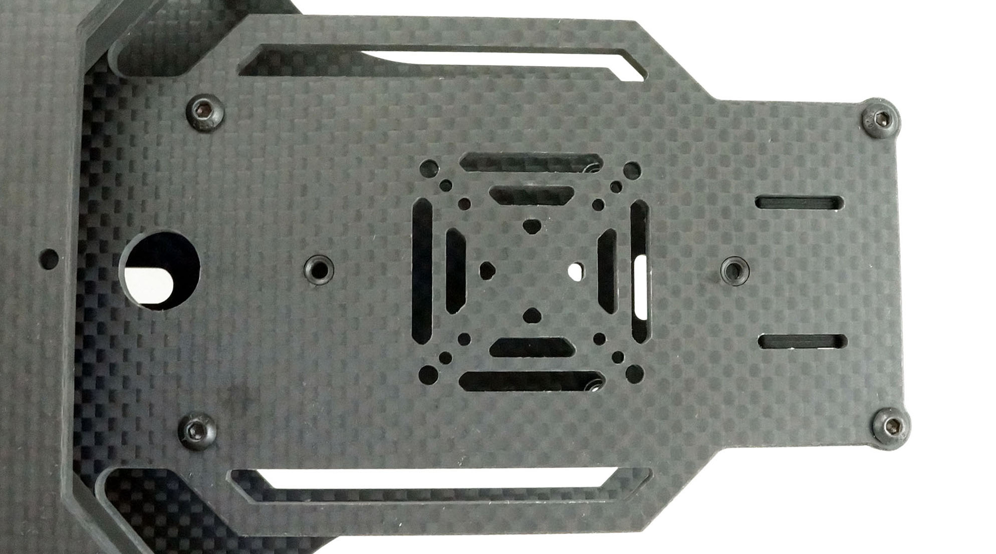 Ve střední části je prostor pro hlavní stack s řídicí jednotkou a případnými 4v1 regulátory. Rám pojme pouze stacky s roztečí děr 30,5x30,5mm. Ze spodní strany jsou opět M3 závity pro snadné uchycení payloadu a 3D tištěných doplňků.