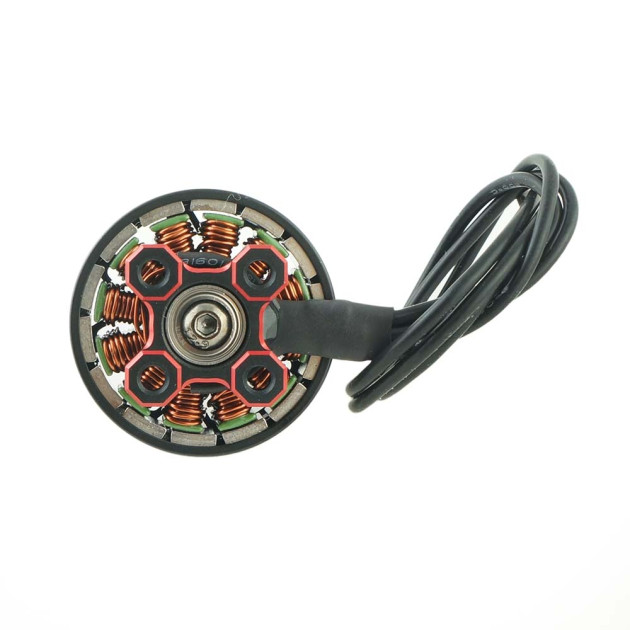 Kvalitní motory používají přesná ložiska (např. NSK, NMB nebo EZO), lehké hliníkové zvony (7075), titanové hřídele a oblé magnety (N52H), které minimalizují vzduchovou mezeru mezi statorem a rotorem. Díky tomu mají menší ztráty, rychlejší odezvu a vyšší účinnost.